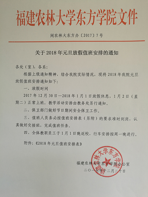 关于2018年元旦放假值班安排的通知