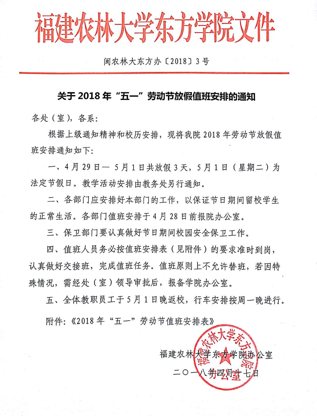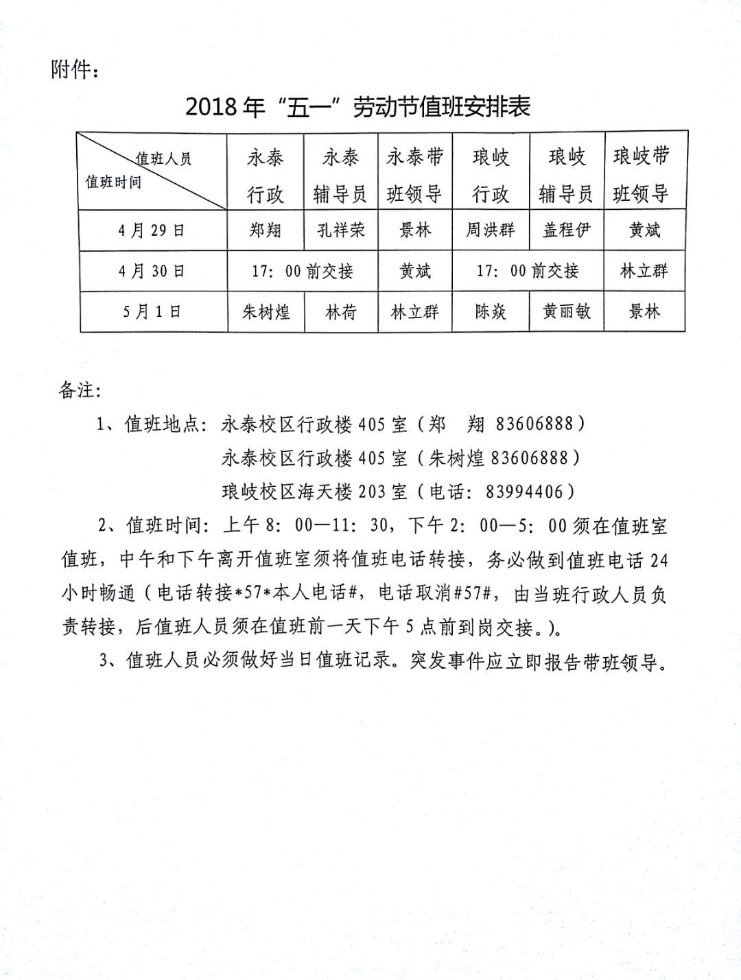 关于2018年五一节放假值班安排的通知