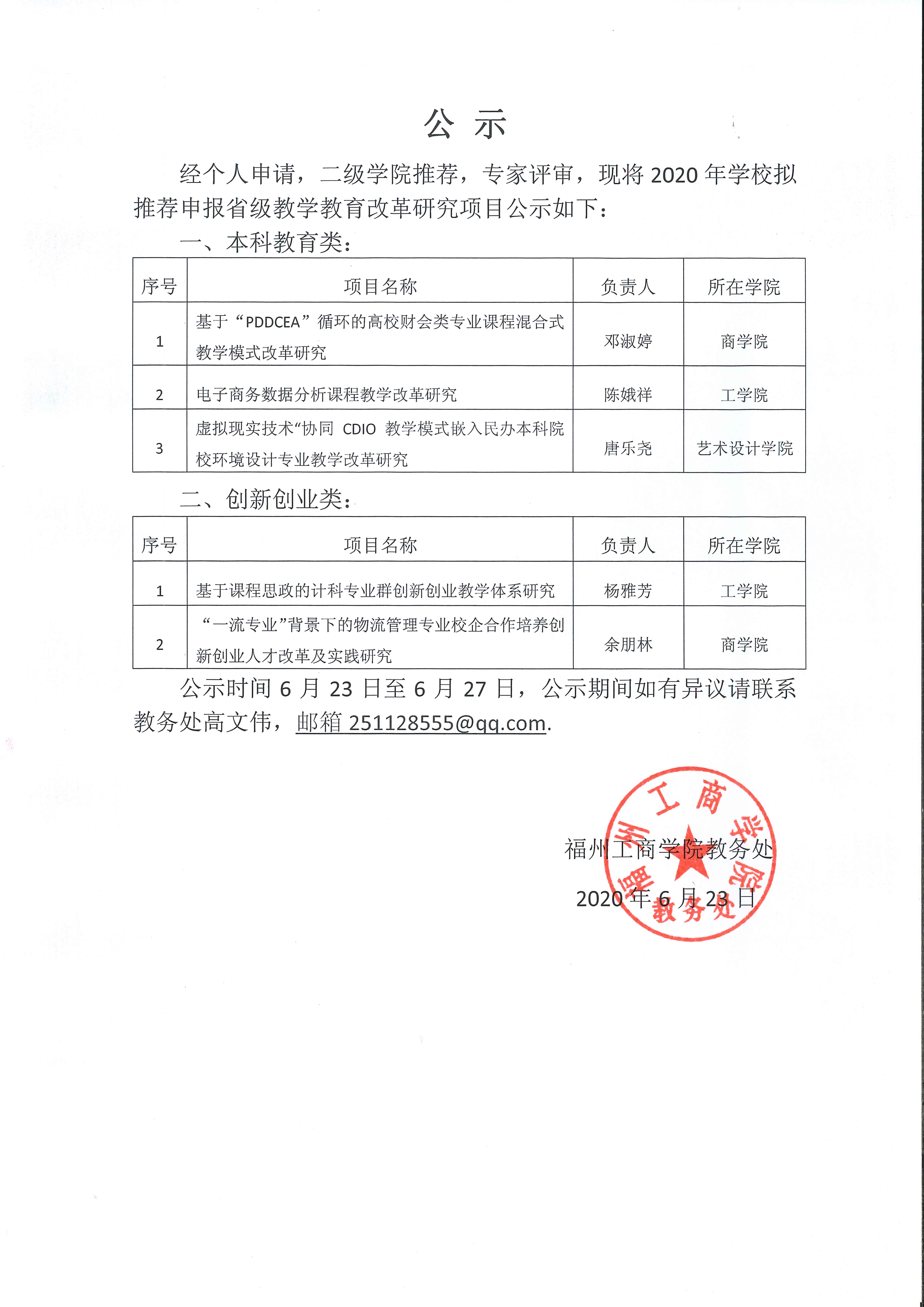 2020年学校拟推荐申报省级教育教学改革研究项目公示