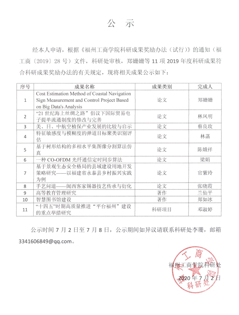 关于2019年度科研成果奖励的公示