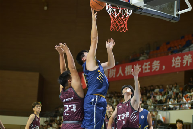 对决赛在工学院和财经学院两队中展开。决赛哨响,战火即刻点燃。财经学院队展现出强大的内线统治力,利用身高优势频频冲击篮下;而工学院队则以灵活的传切配合和精准的中远投予以回应。上半场比赛,双方比分紧咬,引得观众阵阵欢呼,每一寸空气都弥漫着紧张与期待。
