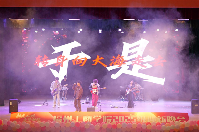 浪潮乐队以一曲《山海》拉开晚会大幕,激昂的旋律如浪潮奔涌,瞬间点燃全场热情。音符碰撞间,仿佛山海呼应,象征着新生力量与福工商精神的交汇融合,为整场晚会注入了蓬勃朝气。