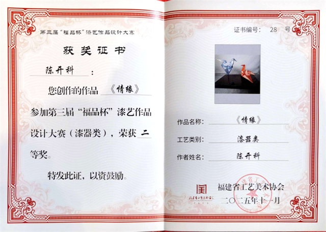 日前,第三届中国漆艺博览会暨第三届“福品杯”漆艺作品设计大赛在福州海峡国际会展中心隆重启幕。福州工商学院艺术设计学院美育与设计工作室全体教师组团赴会交流。陈开科、江雨昕两位老师的漆艺作品成功入选展览,陈开科老师的作品《情缘》成功斩获二等奖,以创作实践彰显学校在漆艺传承创新与教学育人领域的积淀与实力。