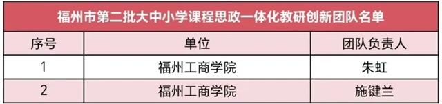 日前,福州市公布第二批大中小学课程思政一体化教研创新团队名单。我校朱虹副教授、施键兰副教授负责的团队分别入选,成为唯一有2支团队入选的高校。