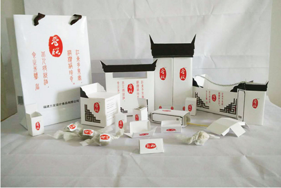 【说明】品牌名称利用三坊七巷的特色,古老的建筑的房子小巷联系到橄榄的这一品牌。包装的造型根据古老建筑的屋檐和巷子里的牌匾的造型进行设计,还有利用古老的窗花在包装上进行点缀刻成镂空,使其这款包装更具有它的独特性,LOGO是用橄榄的形状利用红色的颜色,印章的效果,更突出这个品牌的纪念意义。