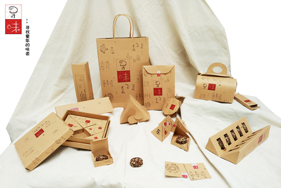 【说明】品牌名称定位在一个糕点类的品牌,品牌命名初衷是寻找童年的味道。产品logo是儿时我们常用的米字格纸,寻字是由蛋糕和溜溜球组成,味字由水杯和弹珠组成,这下都是童年常有的食物和玩具,字体采用卡通体,整个logo都充满着童年的趣味性。纸盒上印出种种大家童年的游戏,为这个包装增加不少乐趣,盒型灵感取自大家童年常玩的玩具有七巧板、东南西北、风车等,这个创意让消费者在食用产品的同时还能在体验一次七巧板等玩具的乐趣,让包装不止有包裹食物的功能,更增加了包装的可玩性。