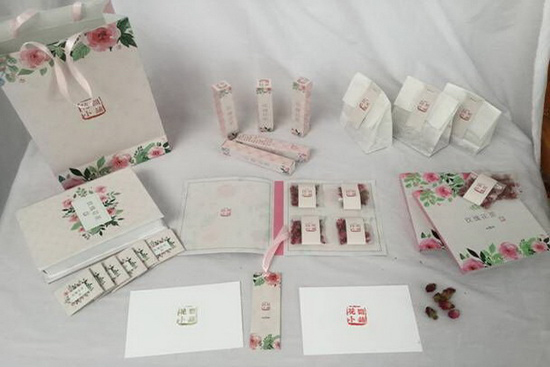 【说明】品牌设计首先锁定对象为年轻群体,在logo的设计上,运用了古典的印章元素,把清新文艺与古典元素相结合,降低了古典风格中的严肃感。在图案的设计上,选择了水彩的玫瑰花元素,既吻合该包装的内容,也营造了一种清新之感。在盒型的选择上,经过对市场上的玫瑰花茶的观察,在包装的中心放在了独立包装的形式上,为满足冲泡时的便利,也设计了贺卡形式的包装,创作灵感来源于人们时常互相赠送礼品,把独立包装的花茶以这样的形式附在卡内,还可写上祝福语之类的,既美观又省事,大气。